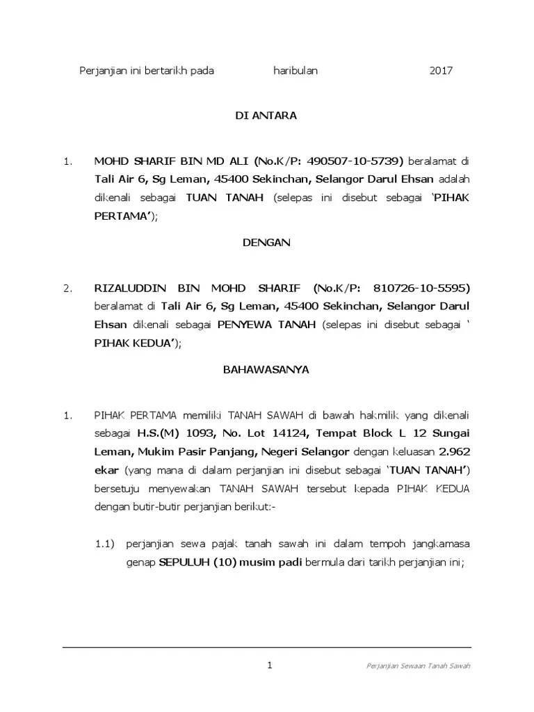 Dalam transaksi sewa menyewa properti misalnya, banyak yang belum mengetahui bagaimana cara membuat surat perjanjian dan poin apa yang . Dengan ini dipersetujui dan diakui bahawa pihak pemilik tanah menerima sejumlah rm sahaja wang tunai pada . Ertinya kerajaan malaysia di mana bagi tujuan perjanjian ini diwakili oleh.